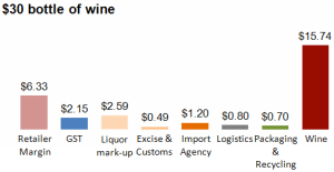 Since launching the Weekly Wine Blog, a few people have asked me why the wines listed are all at least $15. The underlying question is whether more expensive wines are actually better, which is a question that has come up during tastings as well (and is a very valid one!). A recent Bibendum Blog Post addresses this question very well for the UK market, so the illustration below uses their approach to show how spending a few extra dollars increases a wine’s value exponentially in Alberta as well, though the graphics may not be as slick. The numbers are based on pricing information from the Alberta Gaming and Liquor Commission, as well as a few assumptions, listed below.